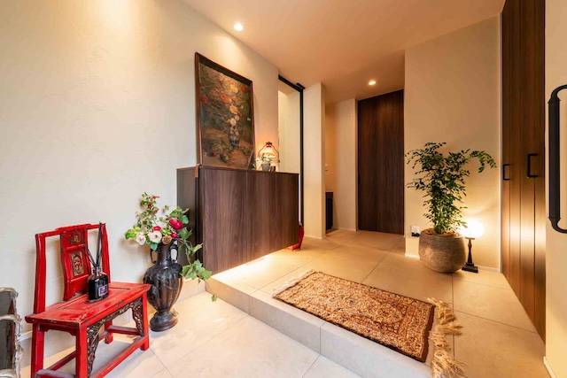 玄関:白いタイルで仕上げた玄関は高級ホテルのエントランスのようなたたずまい。アンティークな花瓶やスタンド照明の使い方にもセンスが光ります。エスニックな雰囲気の赤い椅子が差し色になっていて目を引きます。