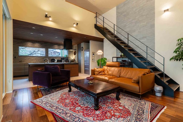 吹き抜け:キッチンとダイニングの上部に設けたロフトは収納スペースとして活用し、リビングは気持ちのいい吹き抜けにしました。