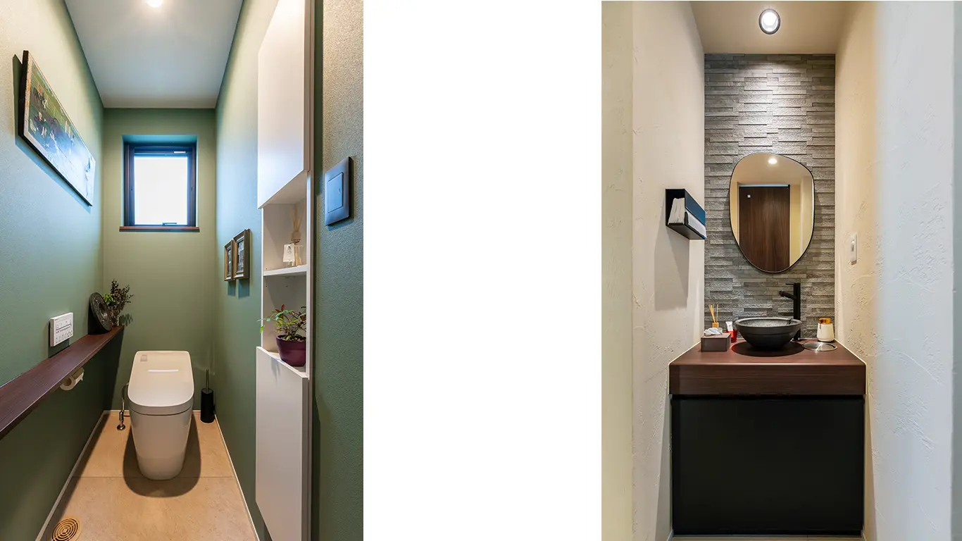 トイレ②:家族用と来客用のトイレはどちらもタンクレスですっきりした印象です。 壁に飾る絵に合わせてクロスの色が選ばれました。