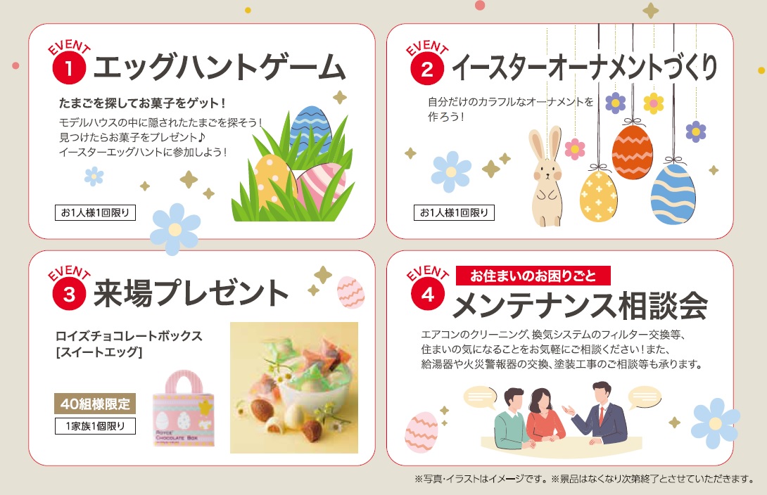 モデルハウスに隠されたカラフルなたまごを探すエッグハントでは、お子さまも大人も夢中に。