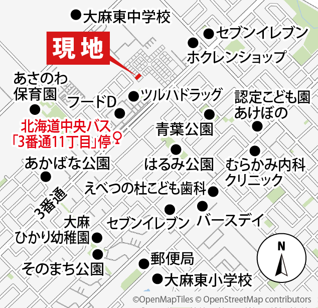 ●所在地/北海道江別市大麻北町520番64(地番)●交通/北海道中央バス「3番通11丁目」停約280m(徒歩4分)●価格[土地+建物]/4,537万円(税込)●土地面積/275.72㎡[83.40坪]●都市計画/市街化区域●用途地域/第一種中高層住居専用地域●建ぺい率/60%●容積率/200%●他の法令制限/北側斜線制限、道路斜線制限、隣地斜線制限、街並協定有●接道/北東側幅員8.00mの開発道路(公道予定)に12.52m接する●設備/電気(オール電化)、上水道(公営)、下水道(公営)●建築確認番号/第東日本26-00751号●建物構造/木造軸組工法●1階床面積/62.93㎡[18.99坪]●2階床面積/45.95㎡[13.87坪]●カーポート面積/15.64㎡[4.72坪]●延床面積/124.52㎡[37.59坪]●間取り/4LDK●建物完成年月/2026年6月下旬完成予定●権利/所有権●引渡し/相談●取引態様/売主 株式会社土屋ホーム ※本物件は都市ガス地域ですがガスは使用しておりません。※家具・家電・装飾品は本体価格に含まれておりません。※町内会設立準備金5,000円負担あり。※建物の面積は1坪を3.3124㎡、土地面積は1坪3.3058㎡とし、小数点第3位を切り捨てて算出しています。