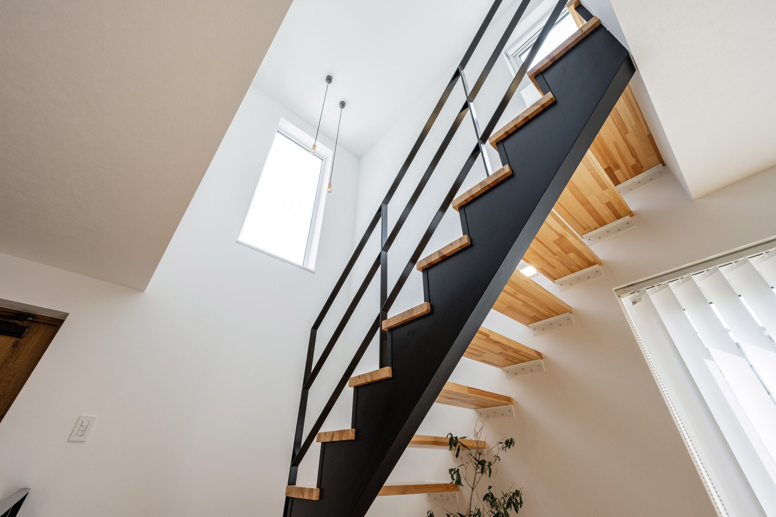 リビング上部と階段まわりに吹抜けを設け、上下の広がりがひと続きに感じられる空間に。