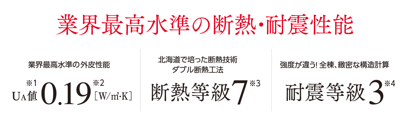 ※1.従来の断熱性能を表す熱損失係数(Q値)に代わる指標が外皮平均熱貫流率(UA値)です。数値が小さいほど性能が高いことを表します。※2.数値は見学物件の数値(2026年4月)。性能スペックはW断熱(外断熱66㎜+GW105㎜)、基礎断熱内外75㎜、天井断熱BW600㎜、トリプルガラスサッシ仕様。UA値0.19W/㎡・KはPremier仕様となります。※3.国土交通省が2022年10月に施工する「住宅の品質確保の促進等を関する法律」による。十和田市(地域区分3)において、断熱等性能等級7に対応するUA値の基準は0.20[W/㎡・K]です。※4.土屋ホームは、「耐震等級3」をクリアした住まい。これは建築基準法レベル(耐震等級1)の1.5倍の強さを示します。「数百年に一度、極めて稀に発生する大地震が起きても、倒壊や損傷がしにくく、構造が安定している」ことの証です。