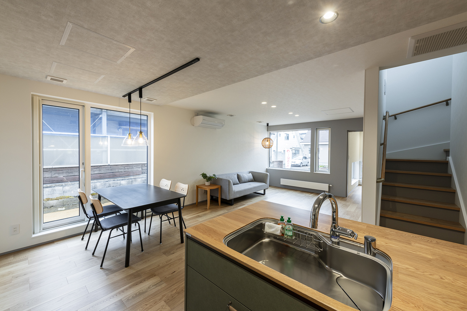 ■20帖の一体型LDK、リビング階段で自然と家族の顔が見えるプランです。