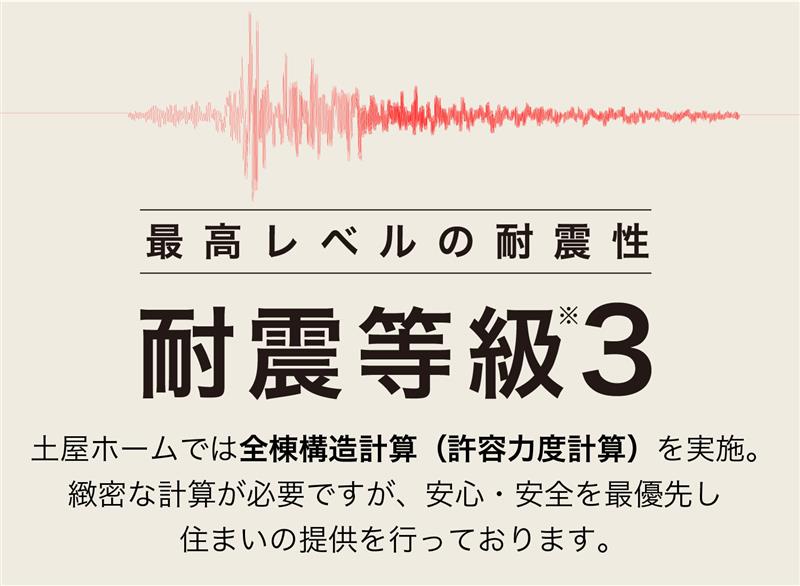 ※国土交通省が2022年10月に施工する「住宅の品質確保の促進等を関する法律」による。断熱性能基準のUA値の数値は地域区分によって異なります。※土屋ホームは、「耐震等級3」をクリアした住まい。これは建築基準法レベル(耐震等級1)の1.5倍の強さを示します。「数百年に一度、極めて稀に発生する大地震が起きても、倒壊や損傷がしにくく、構造が安定している」ことの証です。※外観・内観パースはイメージです。