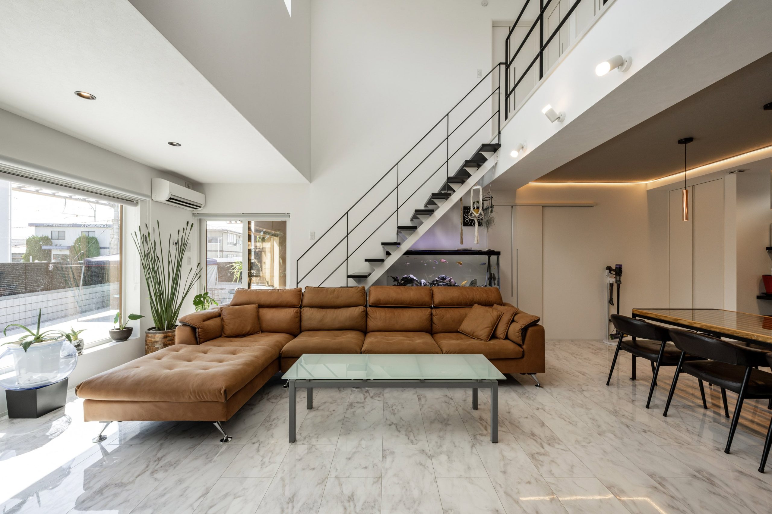 吹き抜けに設けた窓から光が差し込み、昼間は照明に頼らず明るい空間を実現します。