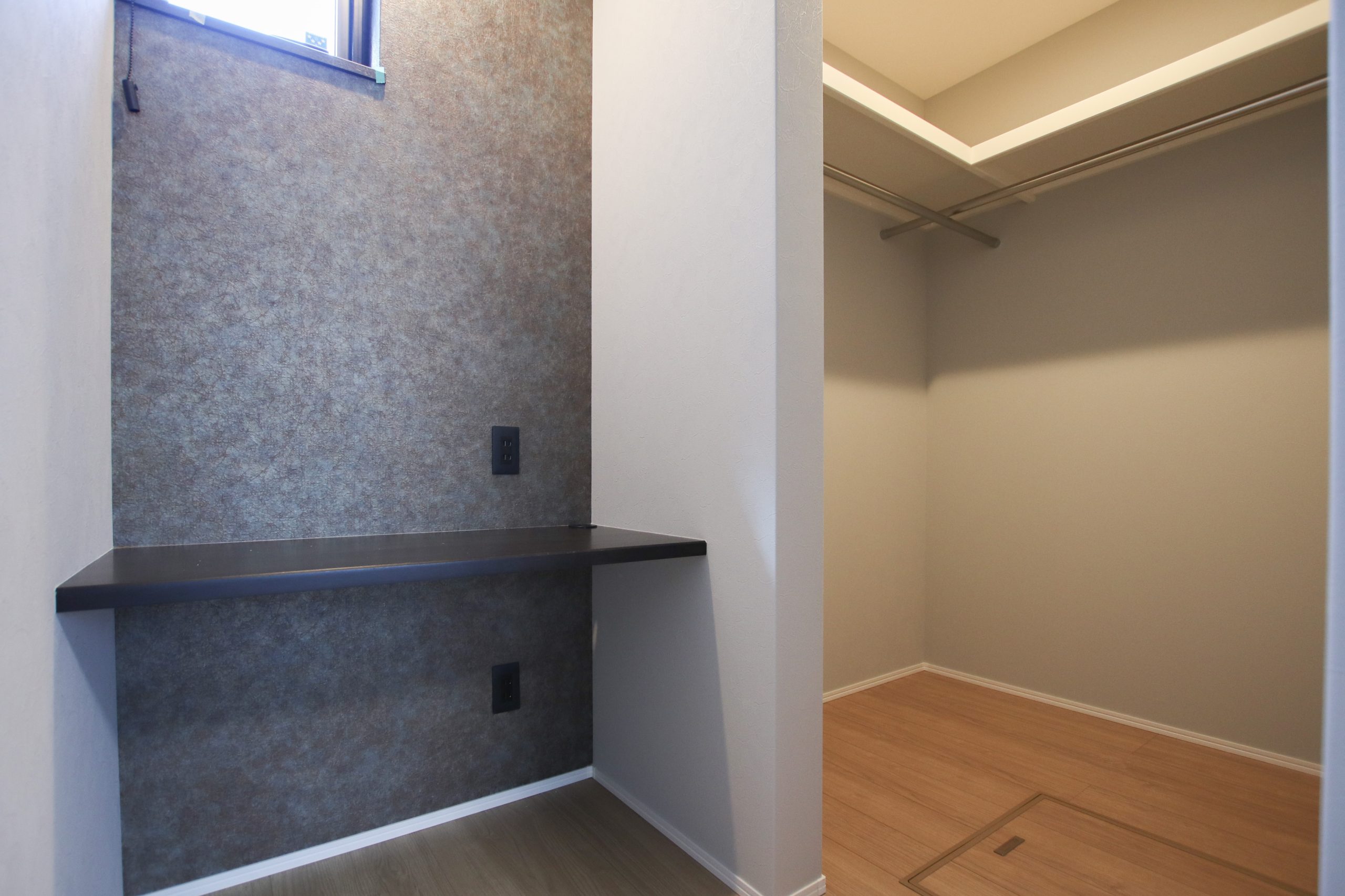 ●ウォークインクローゼットを採用した主寝室。パウダースペースやワークスペースに使用できるカウンターを設置。