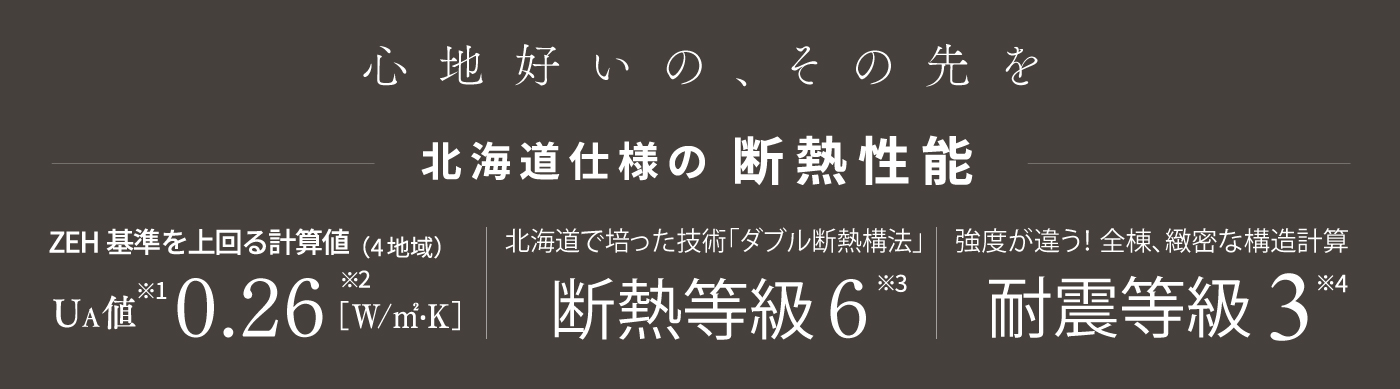 ※1従来の断熱性能を表す熱損失係数(Q値)に代わる指標が外皮平均熱貫流率(UA値)です。※2評価機関株式会社ハウスジーメン発行の一次エネルギー消費量計算結果(住宅版)による数値。性能スペックはW断熱(外断熱50㎜+GW105㎜)基礎断熱内外50㎜、天井断熱BW300㎜、ペアサッシ仕様。UA値0.26W/㎡.Kは計算値。※3国土交通省が2022年10月に施工する「住宅の品質確保の促進等を関する法律」による。断熱性能基準の省エネ地域区分4地域での数値。※4土屋ホームは、「耐震等級3」をクリアした住まい。これは建築基準法レベル(耐震等級1)の1.5倍の強さを示します。「数百年に一度、極めて稀に発生する大地震が起きても、倒壊や損傷がしにくく、構造が安定している」ことの証です。