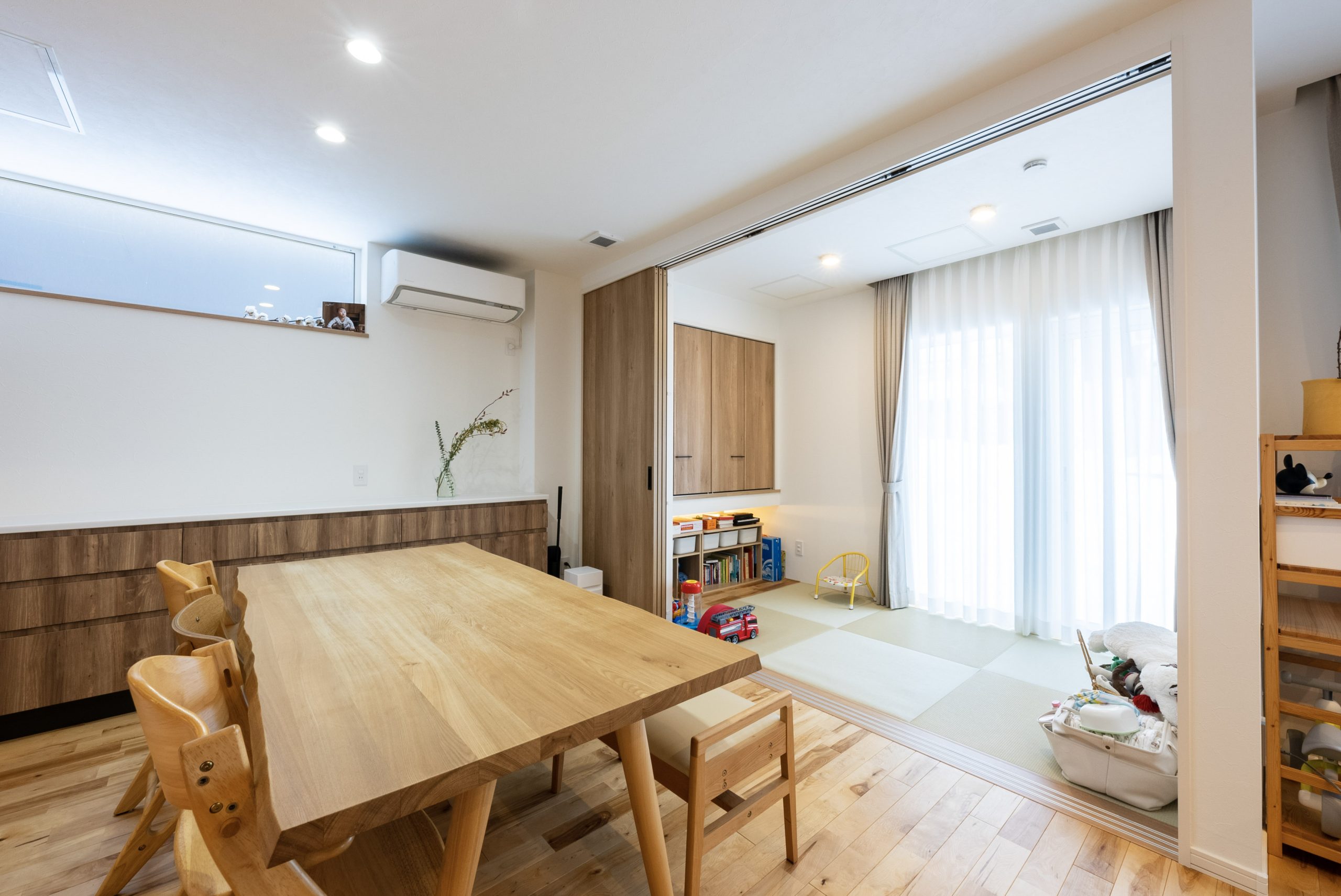 LDKとつながる3.8帖の和室。お昼寝や遊び場、来客対応にも活躍する一部屋。