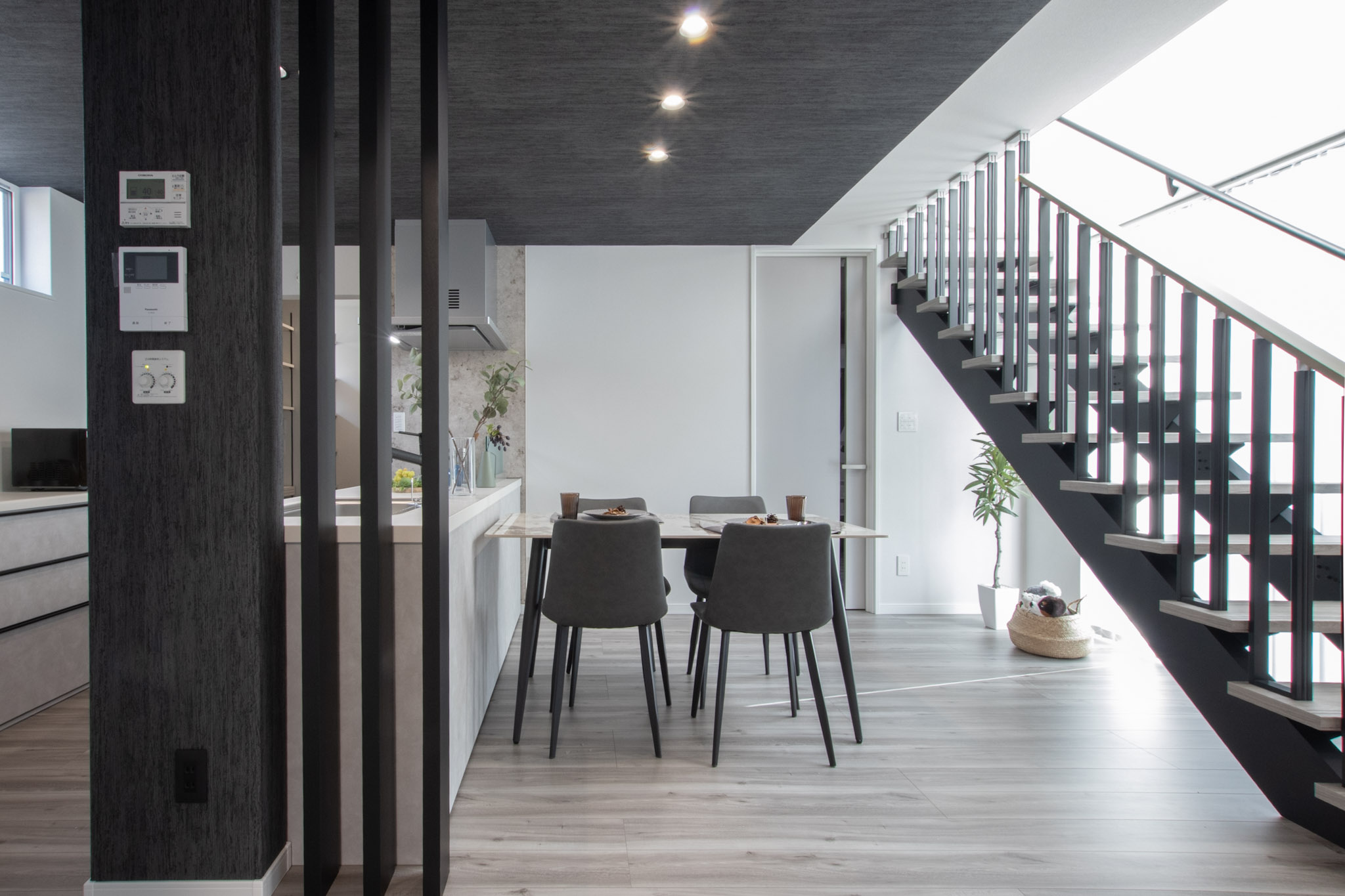 〇階段越しの窓から光が差し込む、抜け感のあるモダン空間。