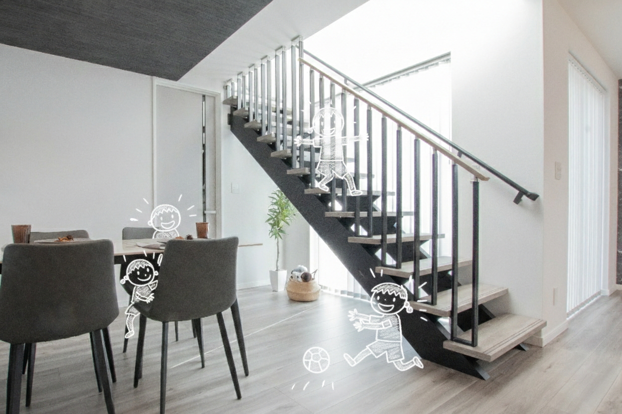 スケルトンのリビング階段を採用した19.5帖のLDK。階段越しに注ぐ光が開放感を演出する、抜け感のあるモダン空間。
