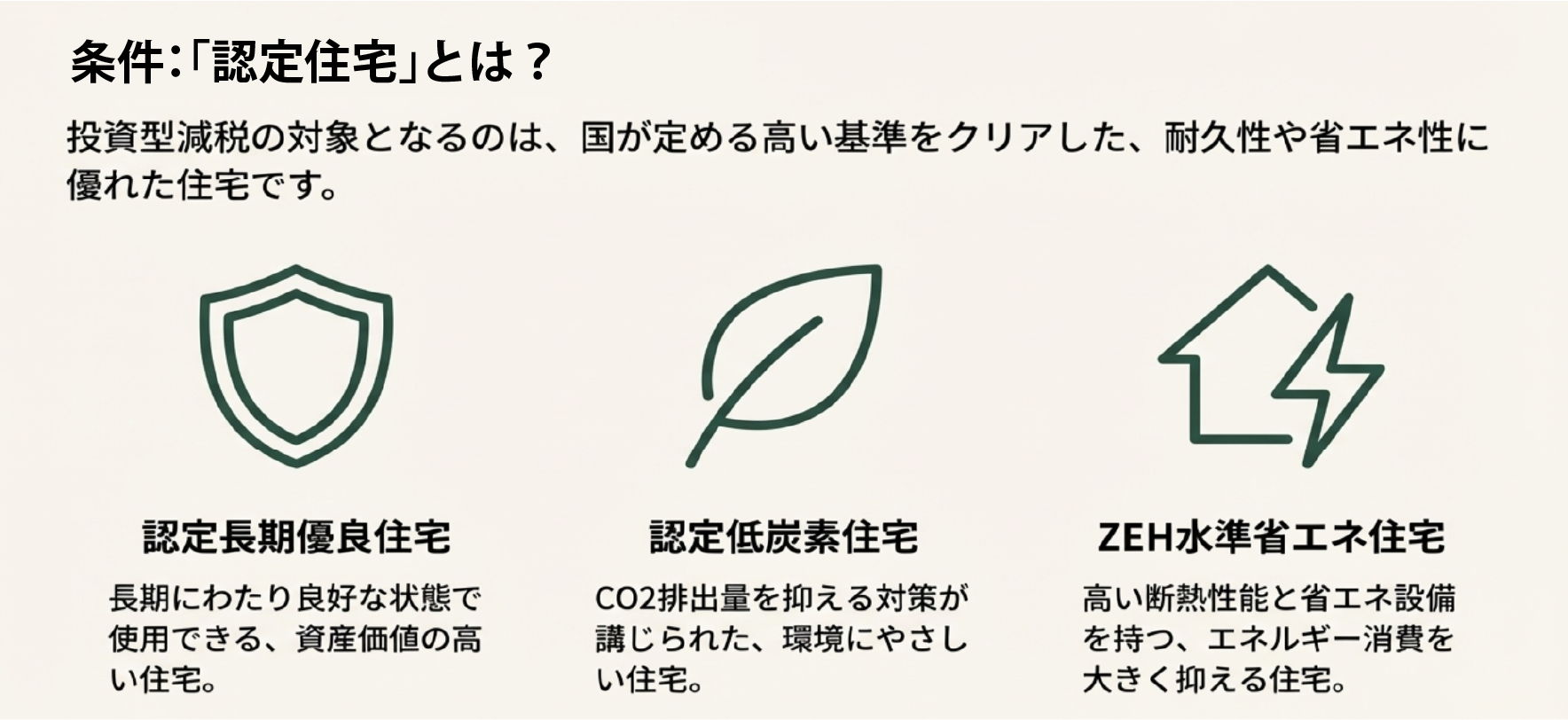 「投資型減税」とは、耐久性や省エネルギー性に優れた「認定住宅」を自己資金で新築・取得した場合に、所得税が控除される制度です。正式名称を「認定住宅等新築等特別税額控除」といいます。元々は長期優良住宅が主な対象だったためこの名称ですが、現在では認定低炭素住宅やZEH水準省エネ住宅も対象に含まれています。