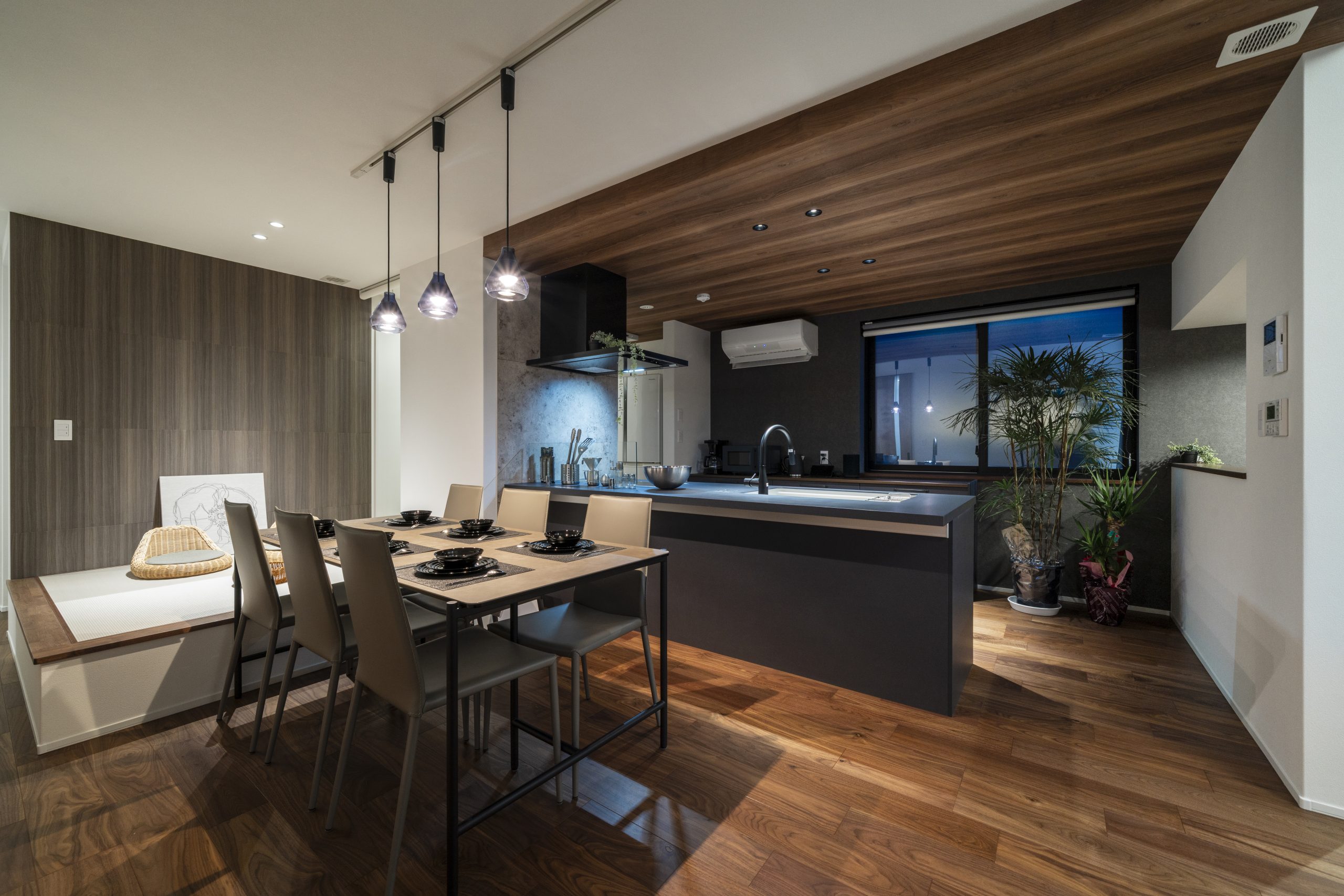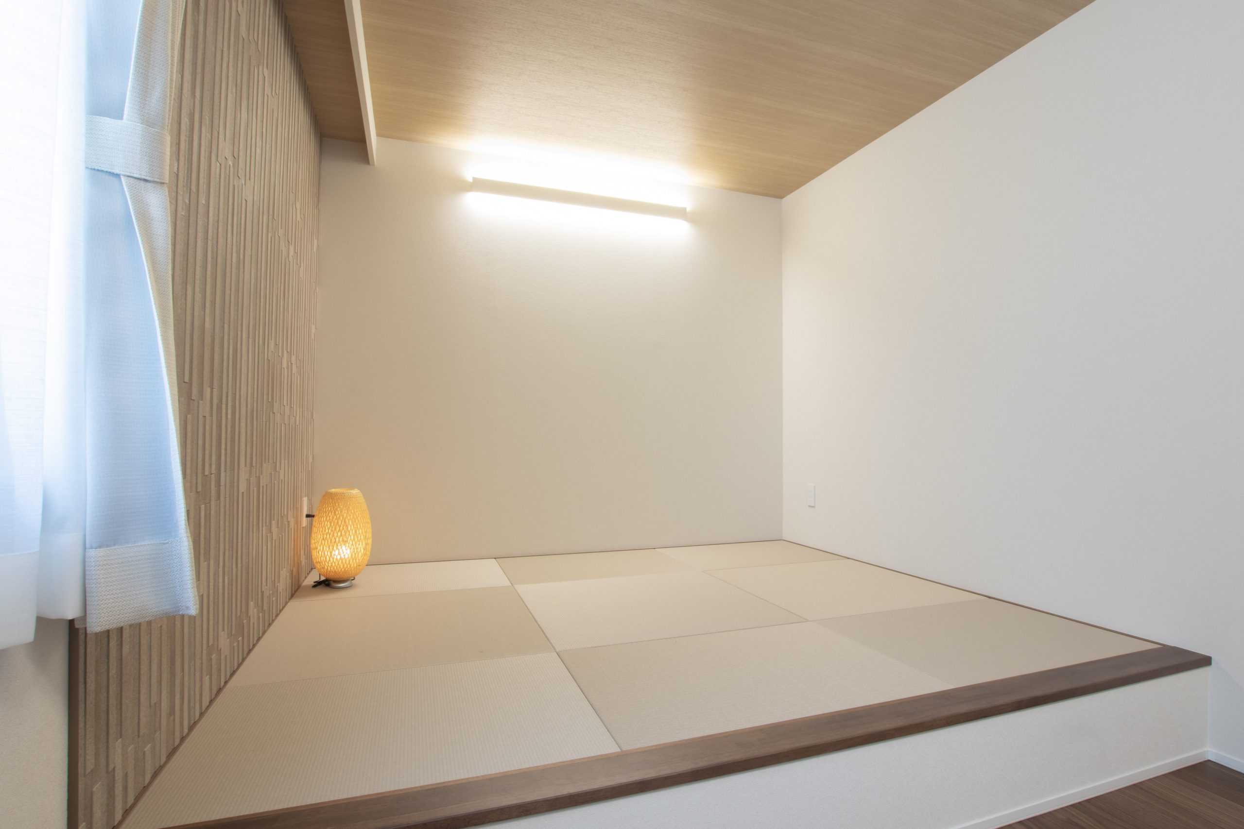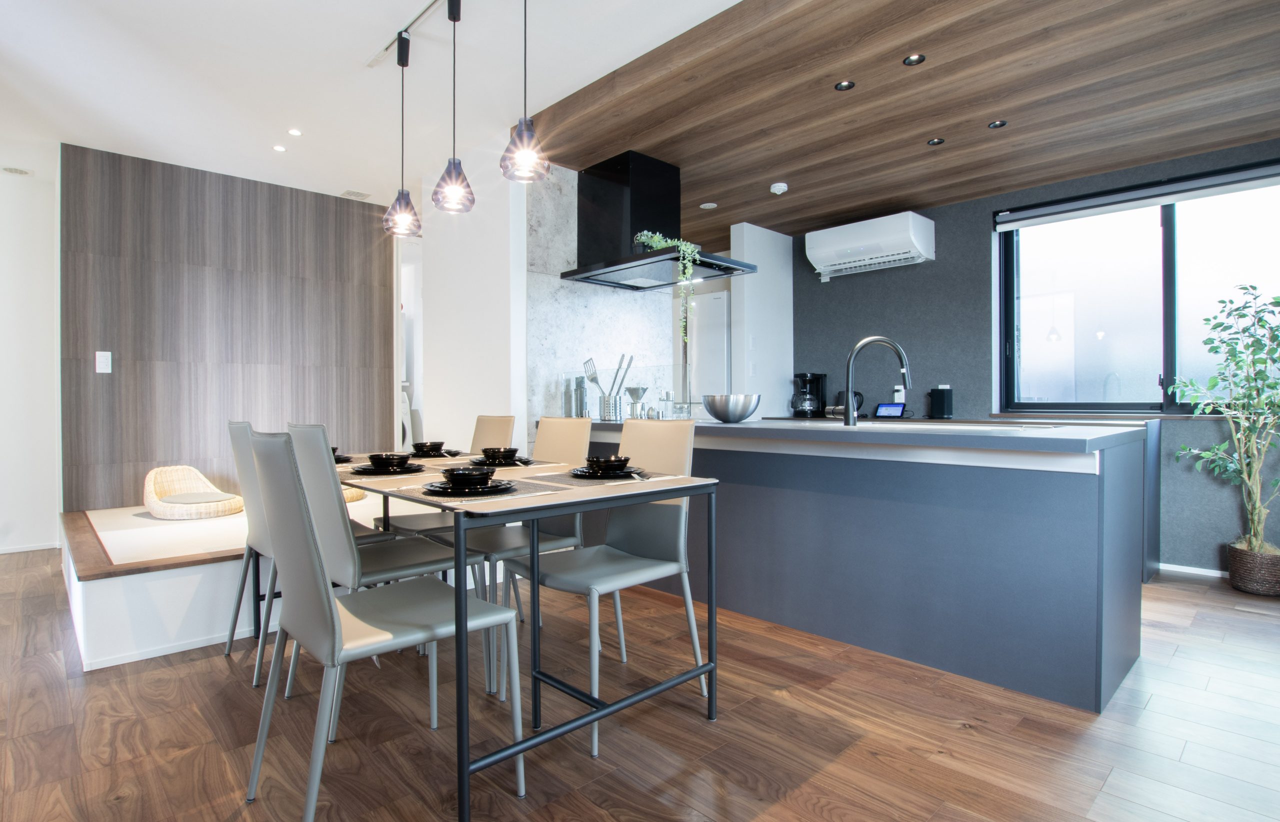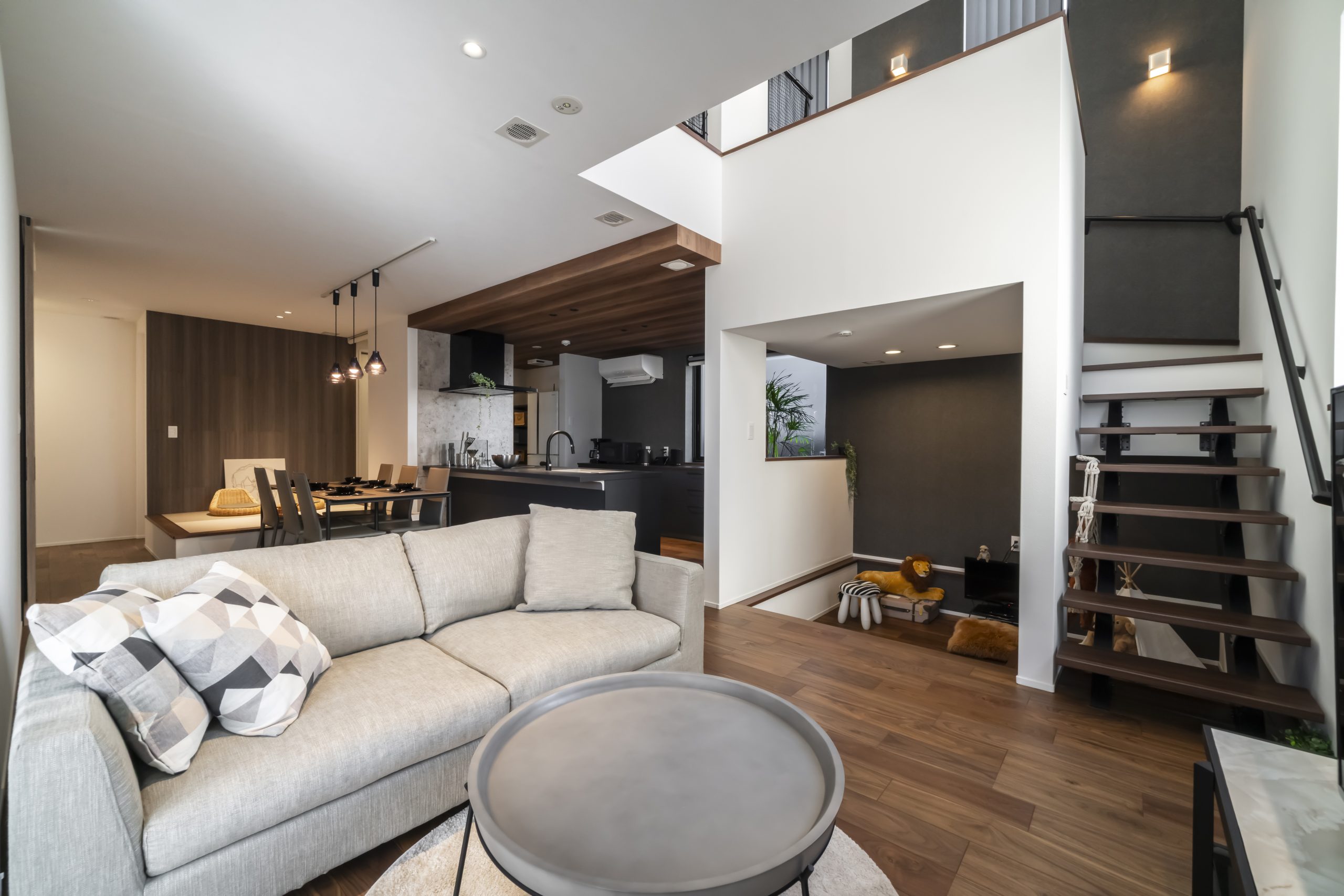 ダウンフロアのヌックスペースや小上がりを採用した間取りで空間にメリハリが生まれ、