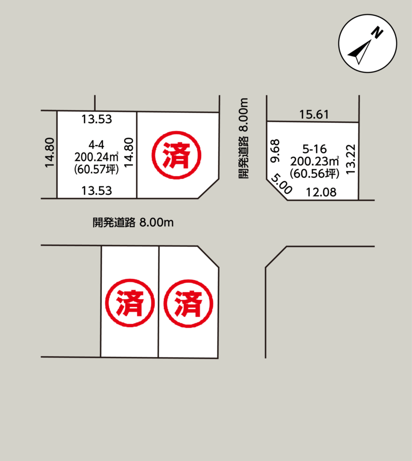 - 接道/【4-4】南東側幅員8.00mの開発道路(公道予定)に13.53m接する【5-16】南東側幅員8.00mの開発道路(公道予定)に12.08m、南西側幅員8.00mの開発道路(公道予定)に9.68m接する