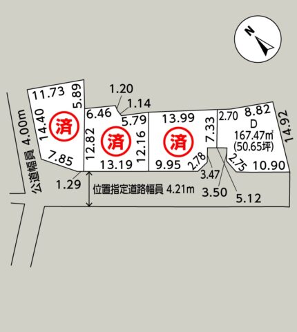 - 接道/南西側幅員4.21mの指定道路に10.90m接する