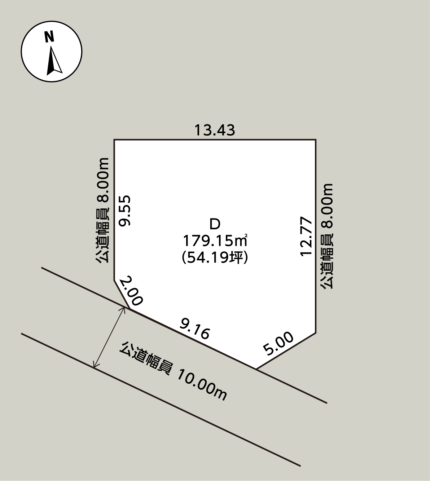 - 接道/南側幅員10.00mの公道に9.16m、東側幅員8.00mの公道に12.77m、西側幅員8.00mの公道に9.55m接する
