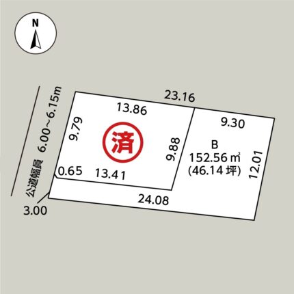 - 接道/西側幅員6.00m~6.15m(不定幅員)の公道に3.00m接する