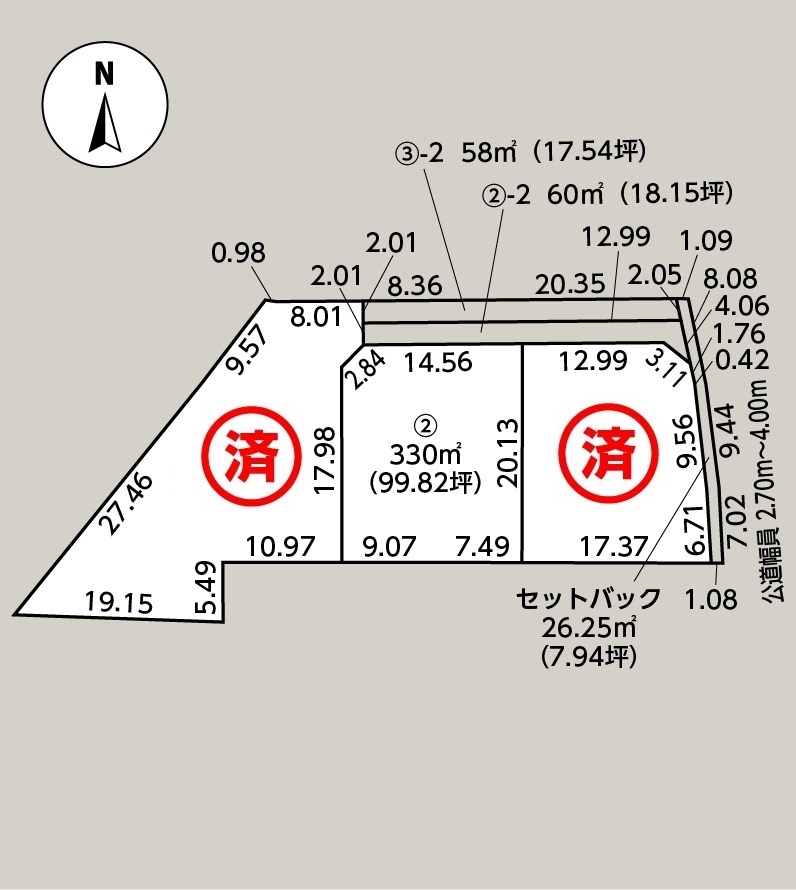 - 地目は造成工事完了後に宅地に変更いたします。地目変更後に、面積が増減する場合があります。分筆予定図を元に記載していますので、辺長に誤差が生じる場合があります。【②】東側道路中心より2mセットバックとなります。セットバック部分は、佐久市に寄付して公道になる予定。宅地延長部分の②の土地は、通路協定があります。②の土地の面積、販売価格には、宅地延長部分(②-2)も含みます。