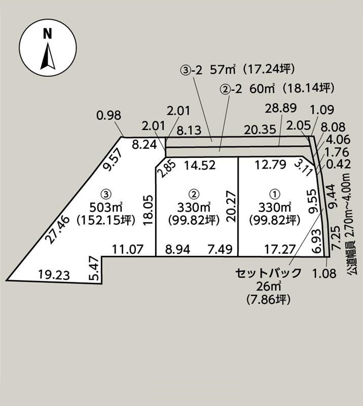 - 接道/【①】東側幅員2.70m~4.00m(不定幅員)の公道に18.66m接する【②】東側幅員2.70m~4.00m(不定幅員)の公道に2.01m(通路部分②-2)接する【③】東側幅員2.70m~4.00m(不定幅員)の公道に2.01m(通路部分③-2)接する