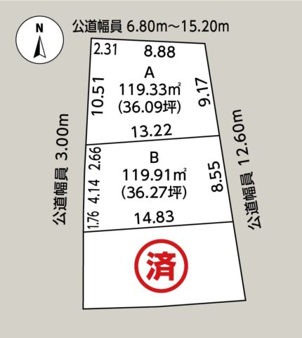 - 接道/【A】東側幅員12.60mの公道に9.17m、北側幅員6.80m~15.20m(不定幅員)の公道に11.19m、西側幅員3.00mの公道に10.51m接する【B】東側幅員12.60mの公道に8.55m、西側幅員3.00mの公道に8.56m接する