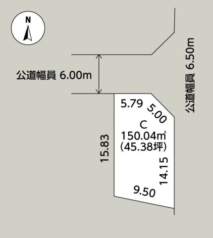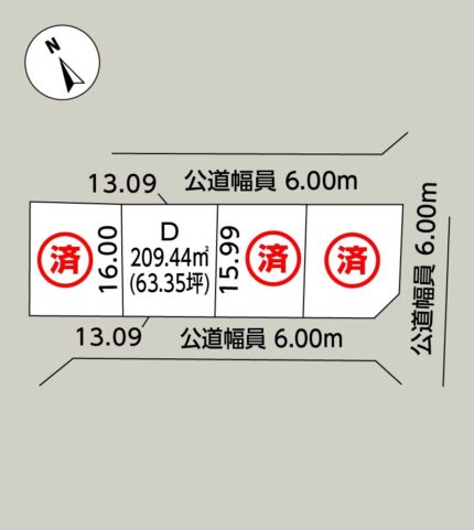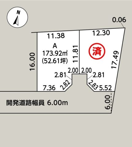 - 接道/南側幅員6.00mの開発道路(公道予定)に14.99m接する