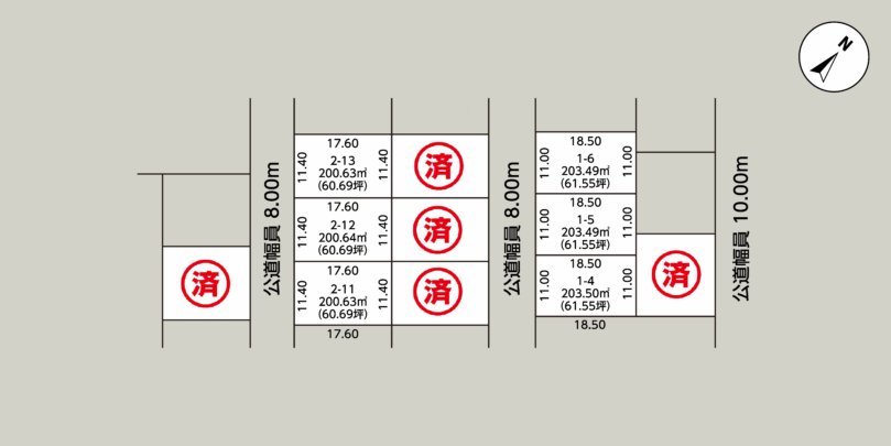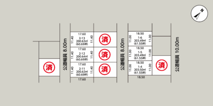 - 接道/【1-4】南西側幅員8.00mの公道に11.00m接する【1-5】南西側幅員8.00mの公道に11.00m接する【1-6】南西側幅員8.00mの公道に11.00m接する【2-11】南西側幅員8.00mの公道に11.40m接する【2-12】南西側幅員8.00mの公道に11.40m接する【2-13】南西側幅員8.00mの公道に11.40m接する