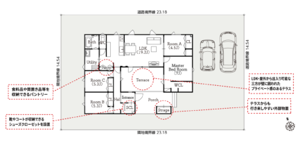 - 接道/北側幅員14.50mの公道に23.18m、※北側公道は都市計画道路に指定されています。(幅員18.00mへの拡幅計画有り)、東側幅員10.90mの公道に14.54m接する