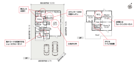 - 接道/北東側幅員12.00mの公道に16.06m、南東側幅員8.00mの公道に8.79m接する