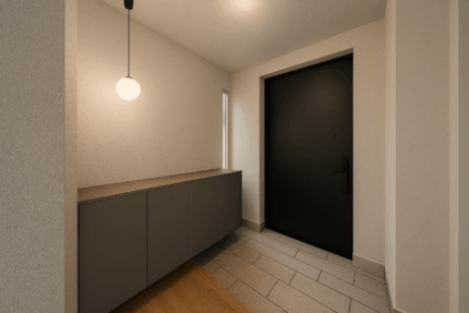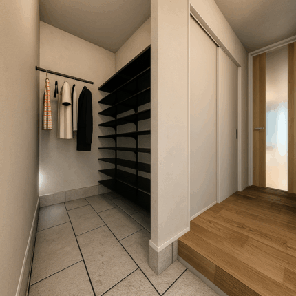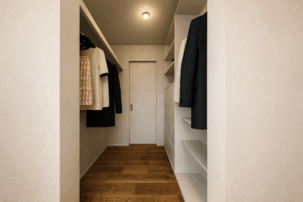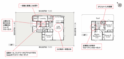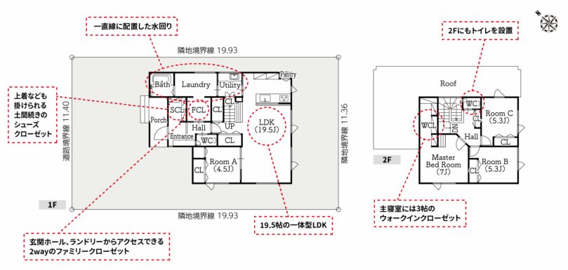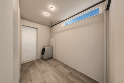 各所の収納や一直線に配置した水回りなど、暮らしやすさに配慮したナチュラルテイスト省エネ住宅