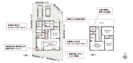 - 接道/東側幅員6.50mの公道に14.15m、北側幅員6.00mの開発道路(公道予定)に5.79m接する