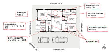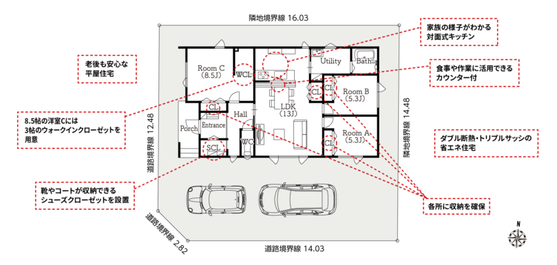 各所に収納を確保し、家事のしやすさにも配慮した平屋住宅